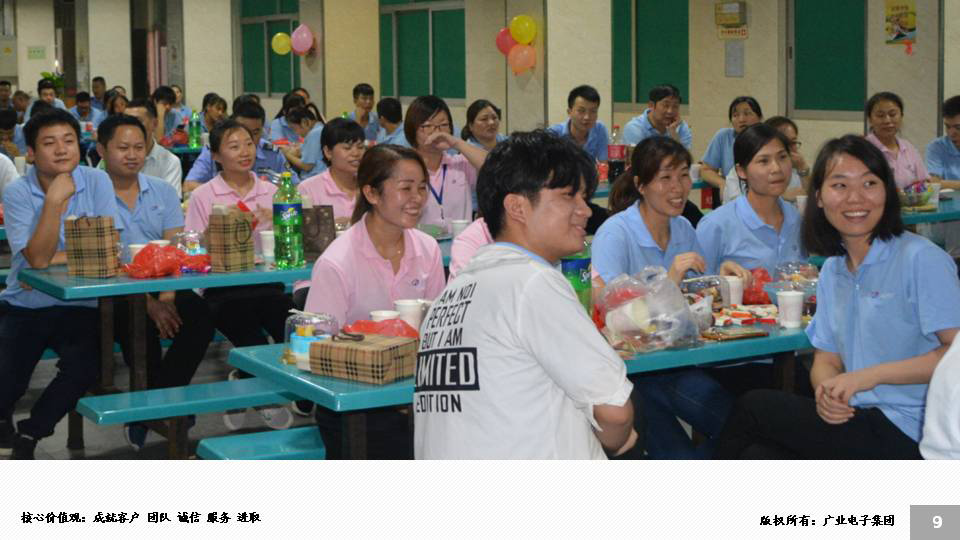 為建立團(tuán)隊(duì)正向溝通,積極向上,溫馨和諧的工作氛圍,激發(fā)員工的工作積極性和熱情;同時(shí)以邀請(qǐng)員工主動(dòng)參與公司層面活動(dòng)的方式,展示我廣業(yè)員工的活力與 風(fēng)采,增強(qiáng)團(tuán)隊(duì)的向心力和凝聚力。2018年7月10日晚,廣業(yè)電子第二季度員工生日會(huì)在公司大食堂舉行,來自各部門近200名員工參與了生日聚會(huì),通過嘉賓送祝福語(yǔ),互動(dòng)游戲,壽星抽獎(jiǎng)送祝福等活動(dòng)環(huán)節(jié)的展開,在員工的積極參與下 ,整體活動(dòng)順利開展,留下陣陣歡聲笑語(yǔ)。